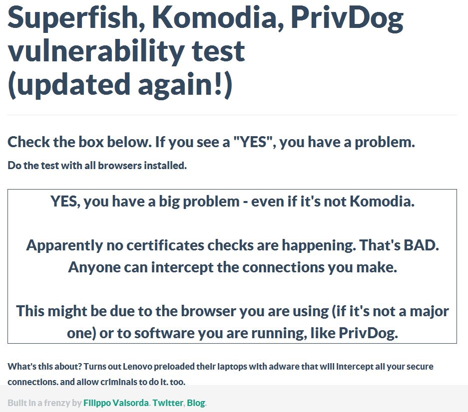 Kauza Superfish, Komodia, PrivDog vulnerability test